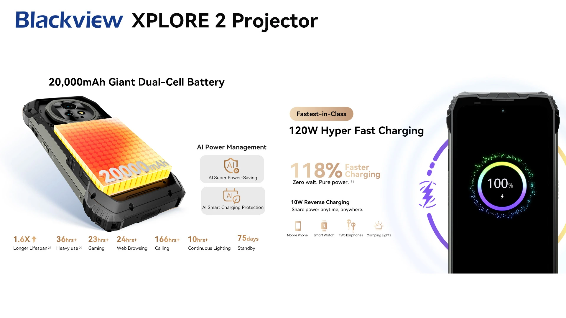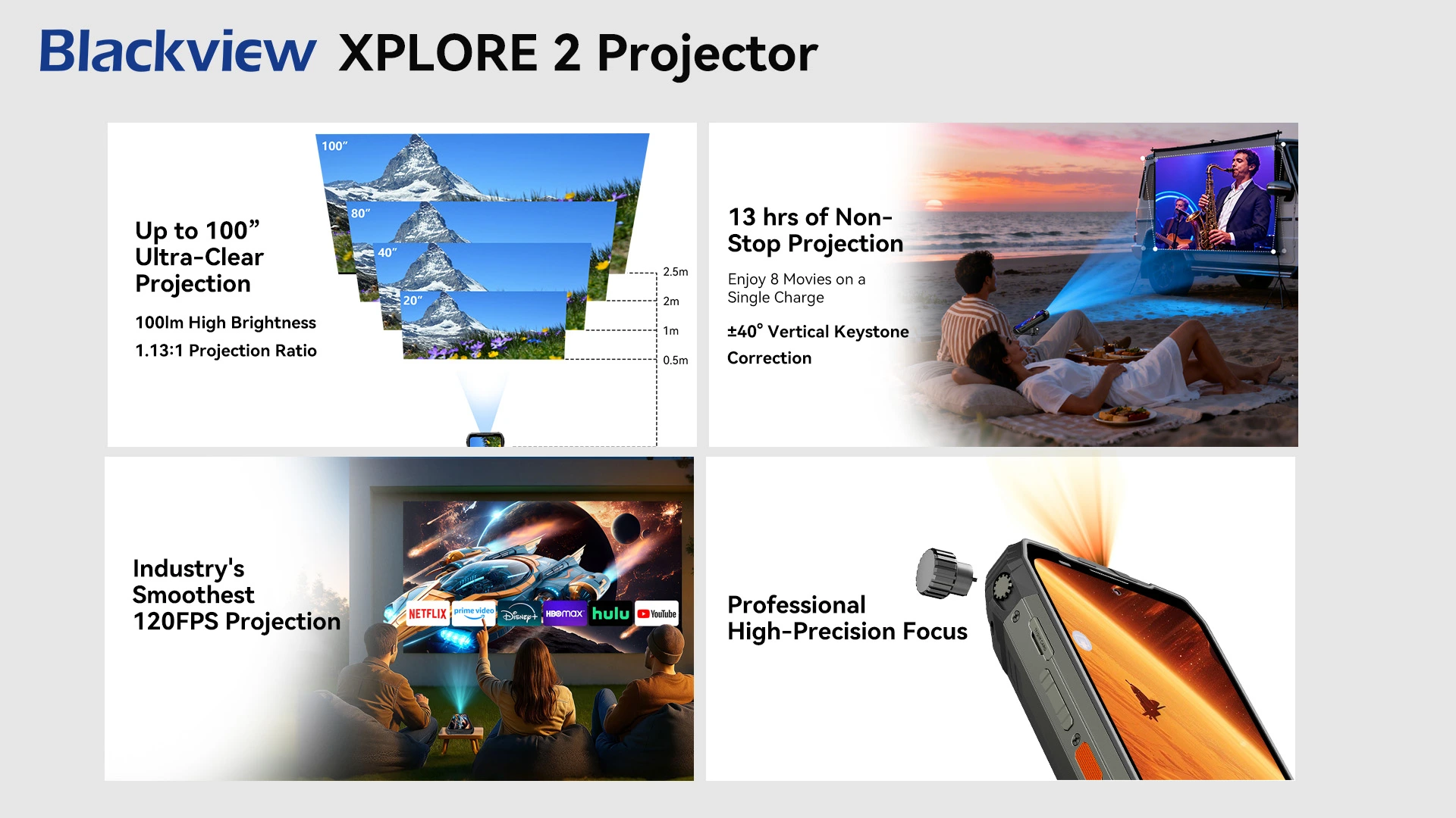 Imagine planning routes during an expedition when your smartphone screen is too small for teammates to see, or explaining project plans on-site without a projector, making team collaboration difficult. Blackview XPLORE 2 Projector solves these problems once and for all! As the first rugged smartphone equipped with a built-in high-precision projector, it can instantly transform any flat surface into a 100-inch cinema-grade giant screen, making sharing more efficient and impactful. Featuring 100 lumens of high brightness and a golden throw ratio of 1.13:1, it delivers clear visuals even in small spaces like tents. Supporting the industry's smoothest 120FPS projection technology, it offers three times the fluidity compared to traditional 30FPS projectors, ensuring no motion blur whether you're watching blockbuster movies or playing intense games. Its external high-precision focus knob allows for professional-grade focus adjustment with just a few turns. With an industry-leading 20,000mAh super battery, it supports up to 13 hours of continuous projection—enough to watch eight movies during outdoor camping trips without worrying about power. Equipped with a 14,000RPM high-efficiency cooling fan and running at a low noise level of 40dB, it keeps the device temperature below 38°C, ensuring a quiet and uninterrupted immersive experience. Additionally, the XPLORE 2 Projector features a built-in 2W Smart-K Box speaker, boosting volume by 30%, making every word audible whether you're on a noisy construction site or camping in the wilderness—it's like having an outdoor cinema in your pocket. Blackview XPLORE 2 Projector is more than just a smartphone; it's a portable projector! From presenting project plans to navigating expeditions or watching movies while camping, it handles it all, making every sharing experience more efficient and impactful.