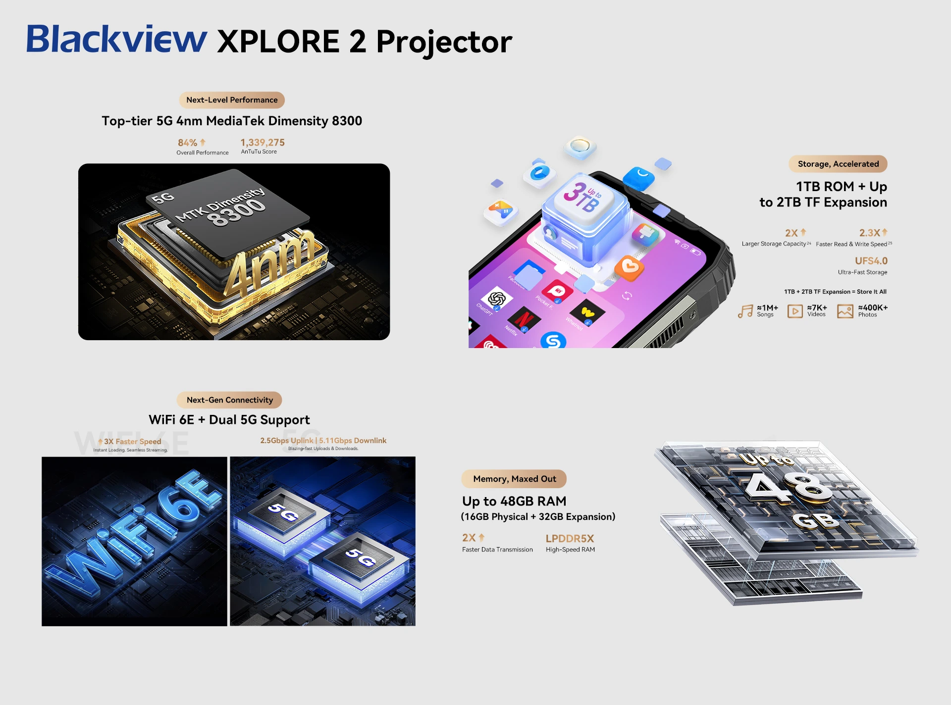 These two models share top-tier configurations, with the XPLORE 2 Projector pioneering the industry's smoothest 120FPS 100-inch high-precision projector. Both devices feature the industry's strongest 6.73-inch 3.2K HDR AMOLED eye-care display, dual 50MP Samsung® cameras with OIS/EIS stabilization, a 20MP Sony® night vision camera, and cinema-grade 4K 60FPS HDR10+ video recording capabilities, achieving full HDR effects from image capture to screen display. They are equipped with the cutting-edge 5G 4nm MediaTek Dimensity 8300 chipset, up to 48GB LPDDR5X RAM, the industry-leading 1TB UFS4.0 ROM, and the latest WiFi 6E technology. With a massive 20,000mAh “power bank-level” super battery and support for 120W ultra-fast charging, they are also the first in the industry to support eSIM virtual cards, feature the industry's only dual waterproof USB port, and integrate Doke AI powered by one of the world's top three AI models. The XPLORE 2 series redefines rugged smartphones with its groundbreaking high-precision projection technology, top-tier rugged capabilities, superior display, exceptional imaging performance, unparalleled computing power, and advanced AI 2.0 assistance, making it not only tougher but also smarter and more user-friendly, ensuring worry-free use even in extreme conditions.