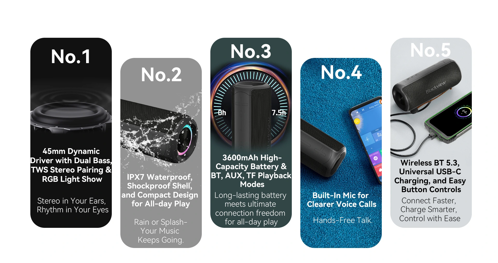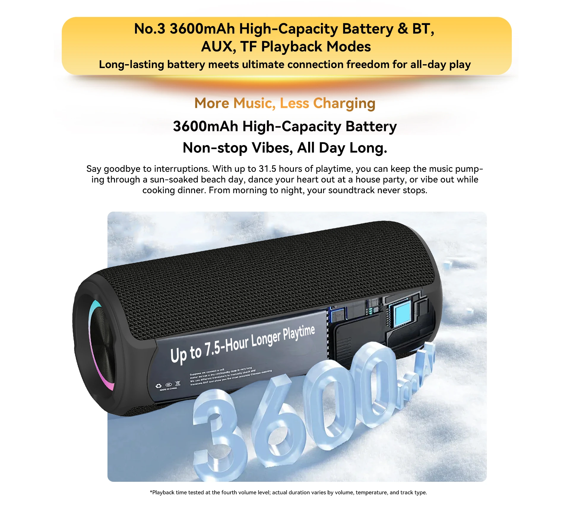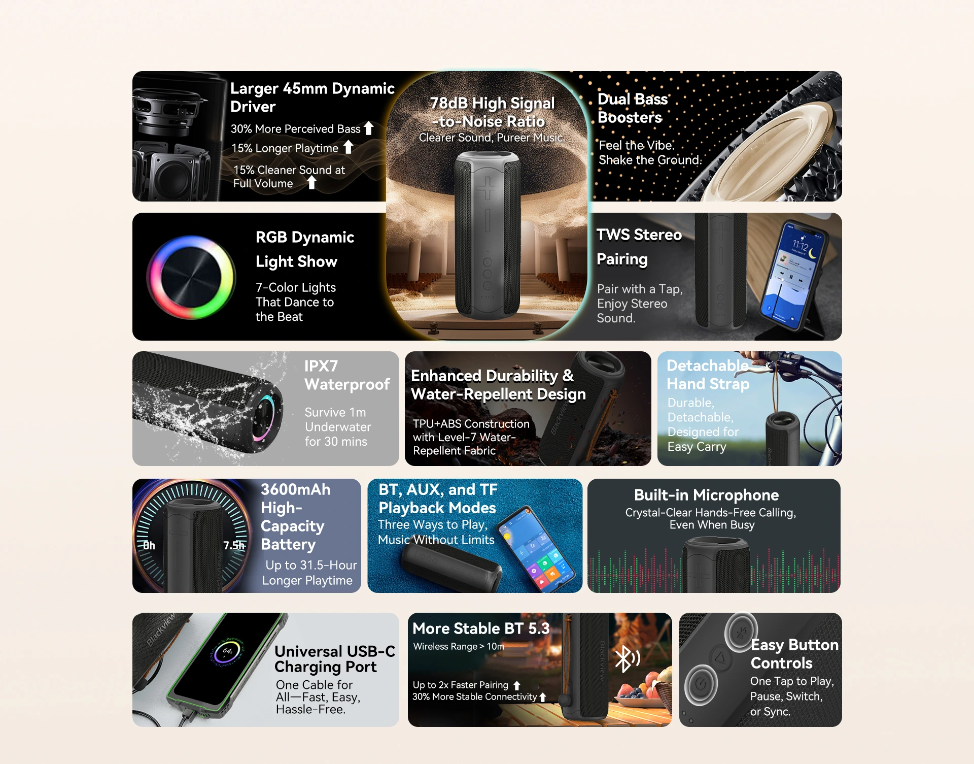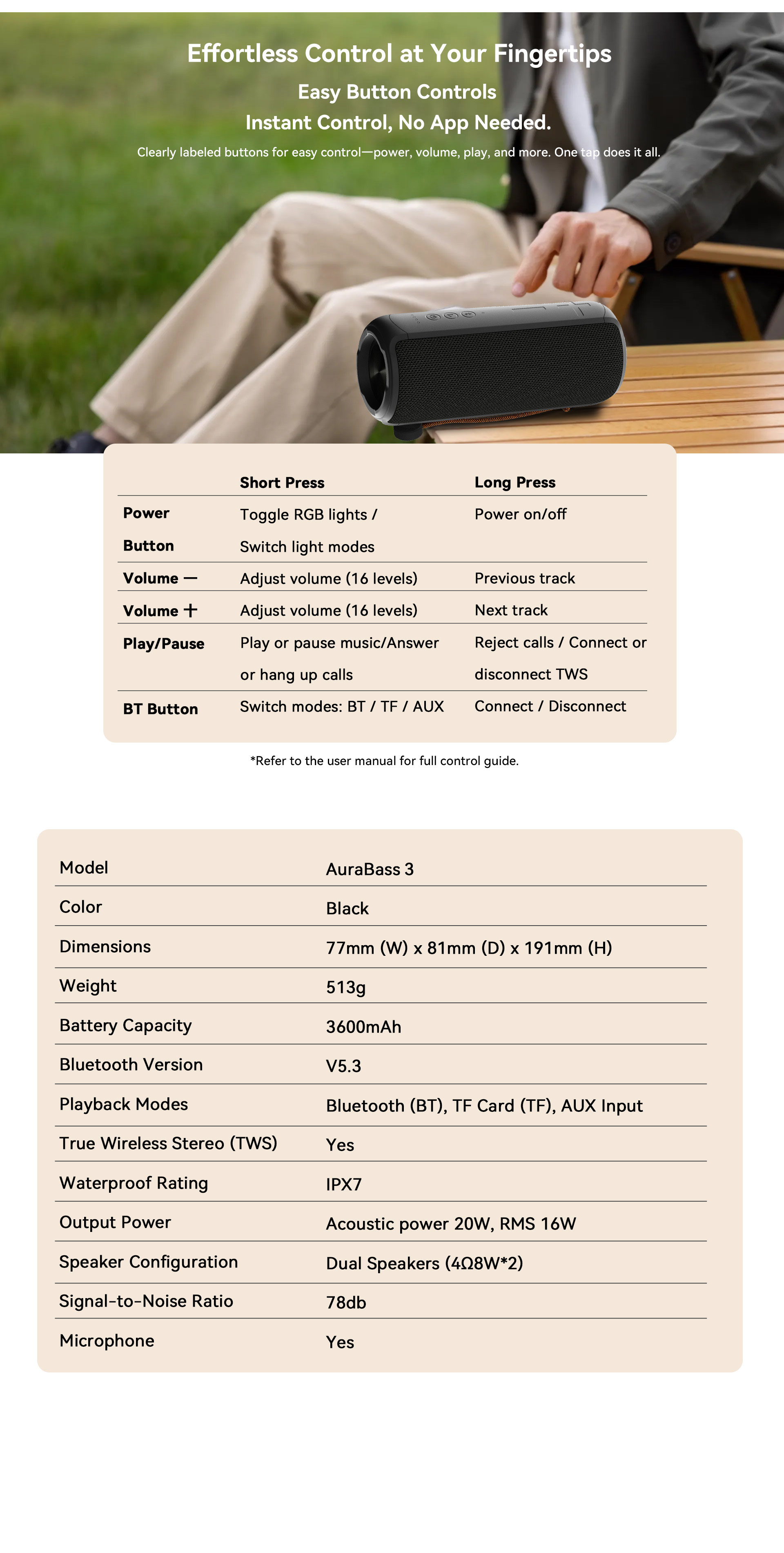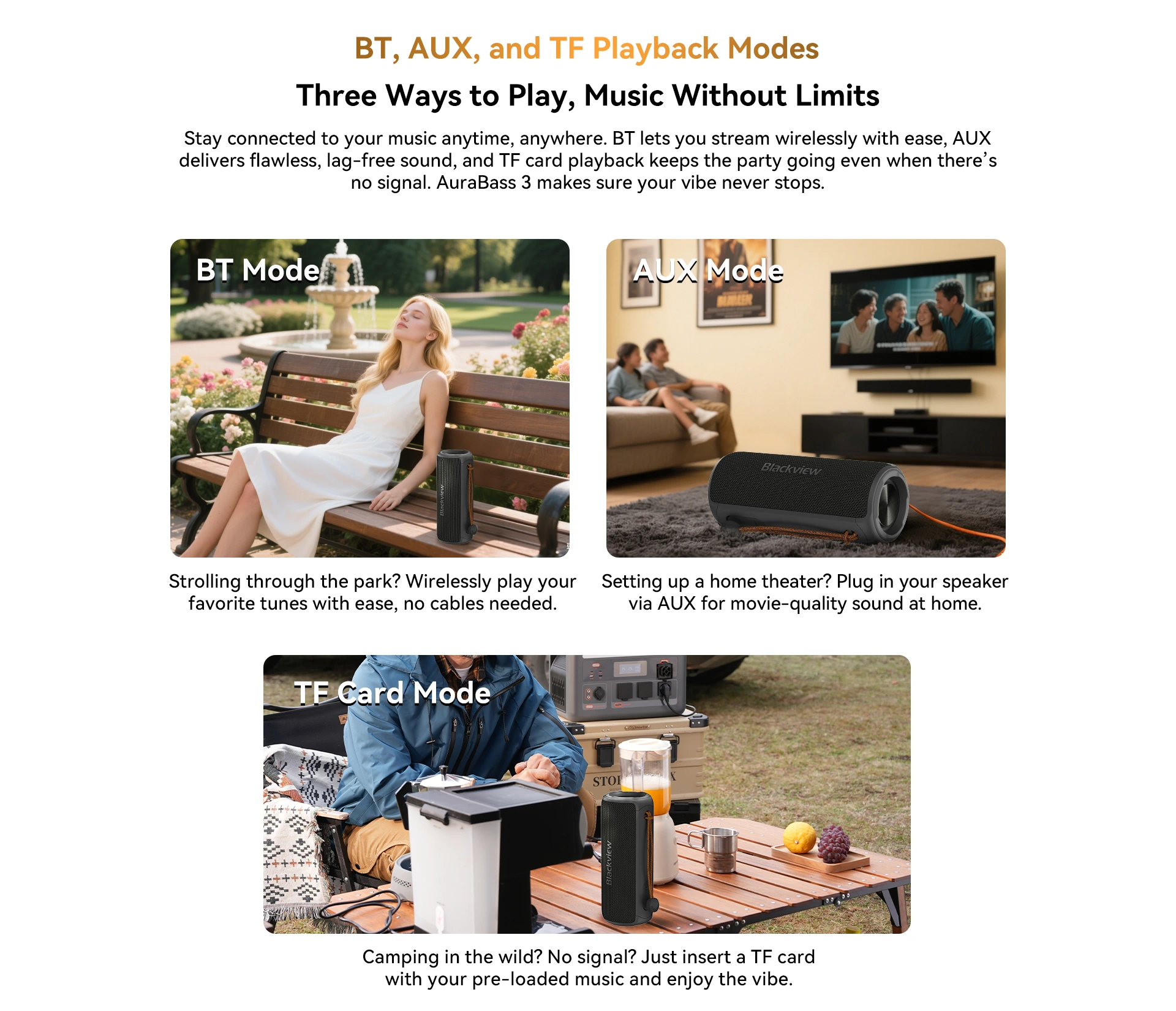 | Playback Modes | Bluetooth (BT), TF Card (TF), AUX Input |
