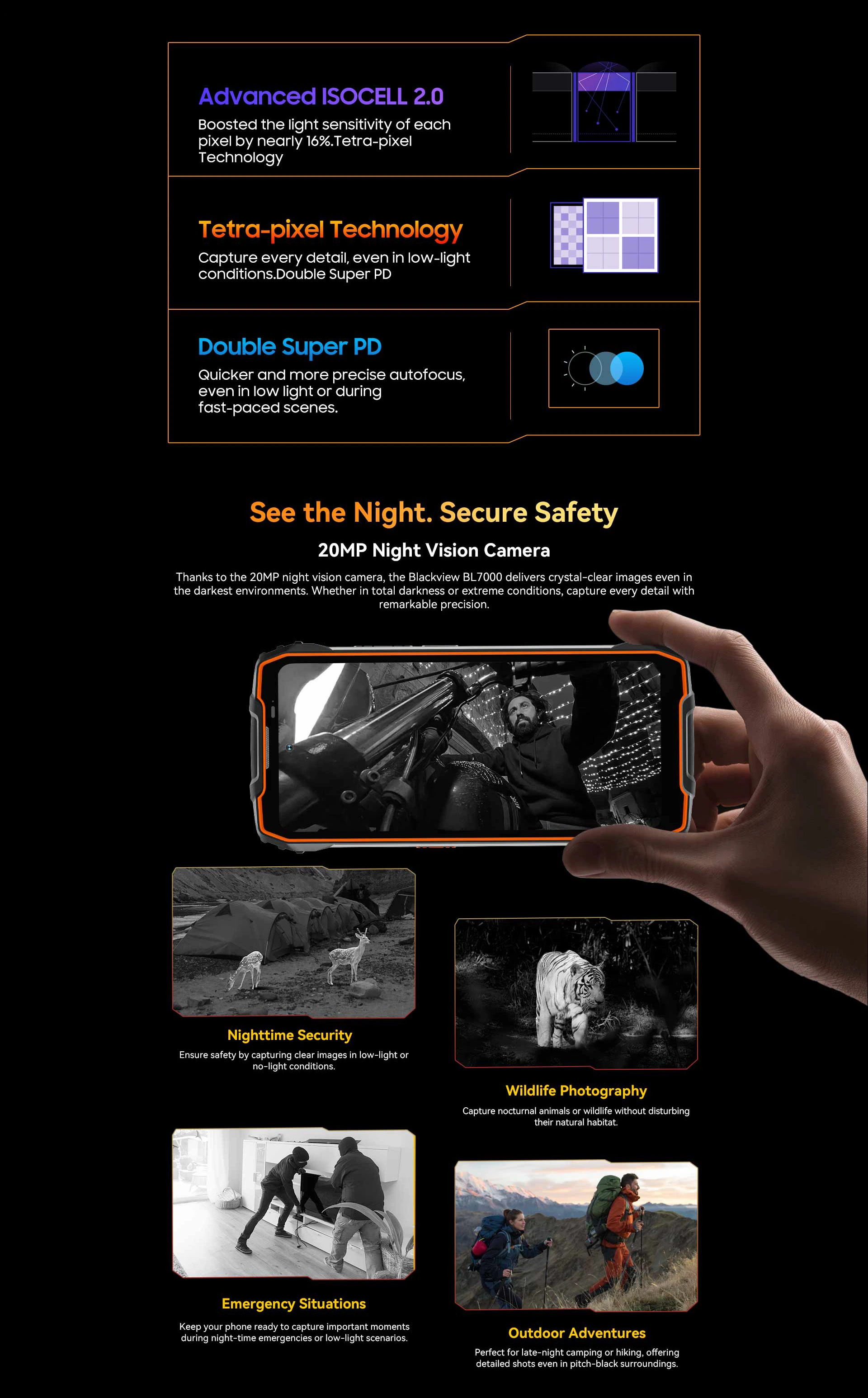 Splash it, drop it, dust it! Just focus on your journey! From rainy days to dusty trails, the Blackview BL7000 is IP68 & IP69 certified for rugged protection against the toughest environments, giving you peace of mind for every step ahead.