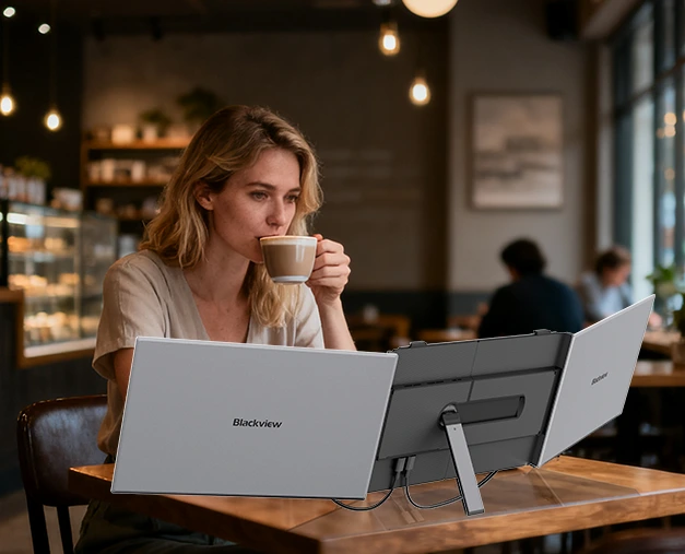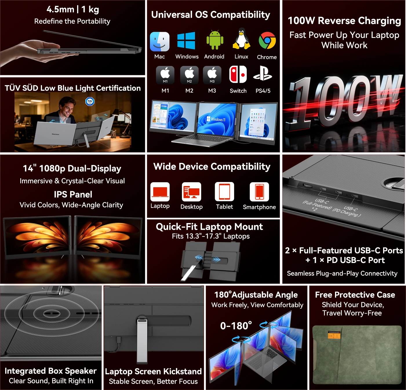 Featuring two 14-inch portable displays, each with 1920 × 1080 resolution and 300 nits brightness, every detail is sharp, smooth, and vibrant. Whether you're multitasking for work or diving into movies and games, the dual-display setup delivers twice the efficiency and immersion.