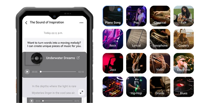 With 16 dynamic styles, craft exclusive melodies from imagination in an instant, adapt to diverse scenarios with flexible tones, and generate professional music works easily without professional skills.