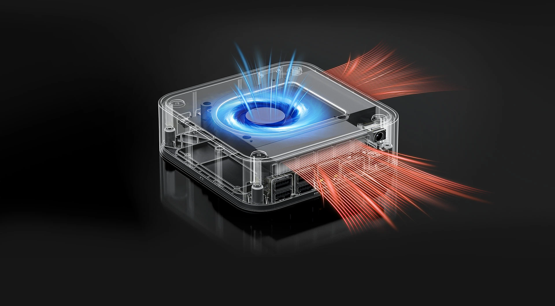 The MP100 Pro comes equipped with a cooling fan that provides a maximum airflow of up to 7.74 CFM, supplemented by copper heat pipes, heat sink fins, aluminum plates, and thermal pads to ensure maximum heat dissipation efficiency and unparalleled performance.
