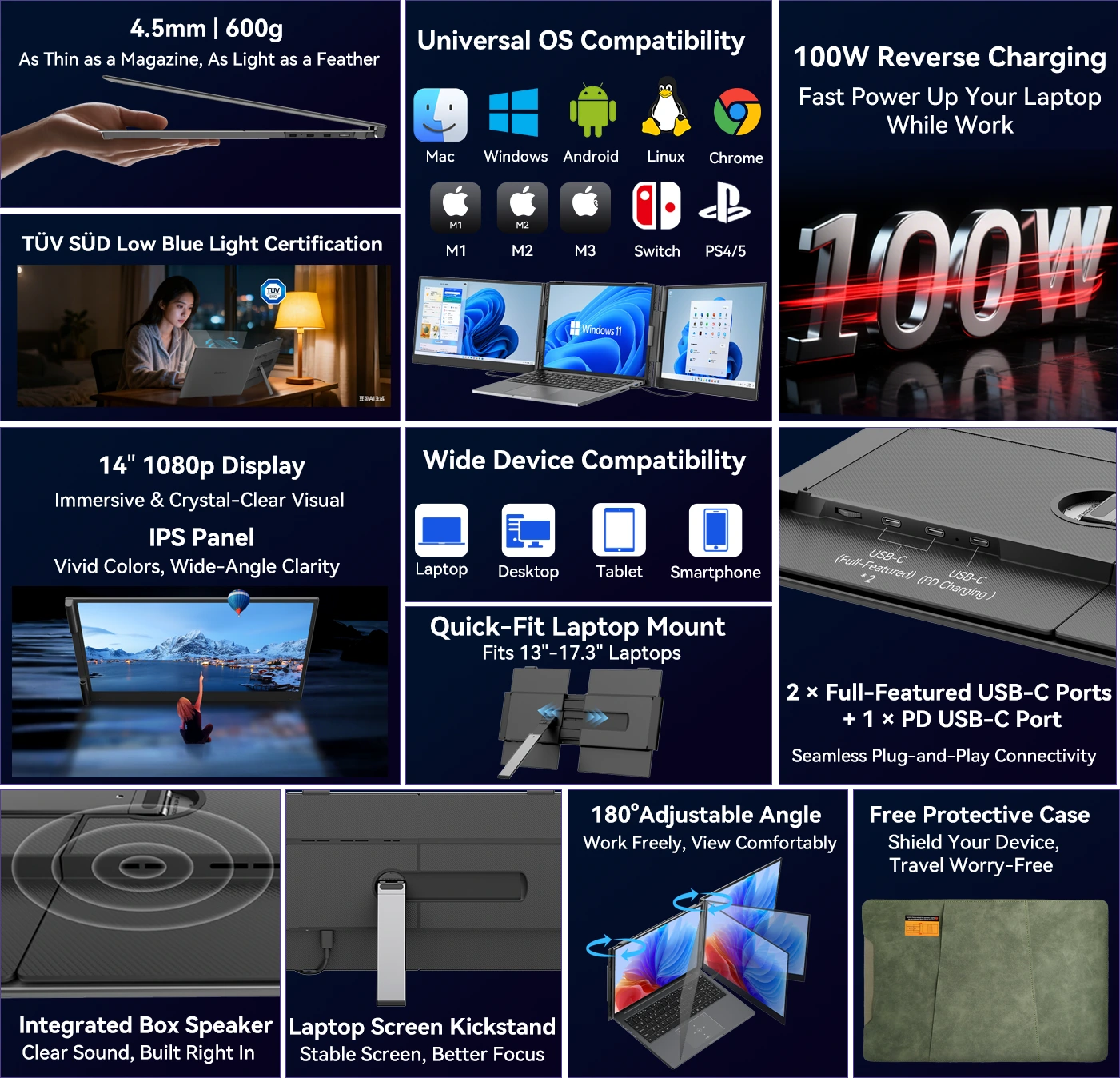 Turn any place into your mobile workstation with dual-screen efficiency. Ultra-light and eye-friendly, it boosts focus, reduces eye strain, and lets you multitask seamlessly—whether working, studying, or creating on the go.